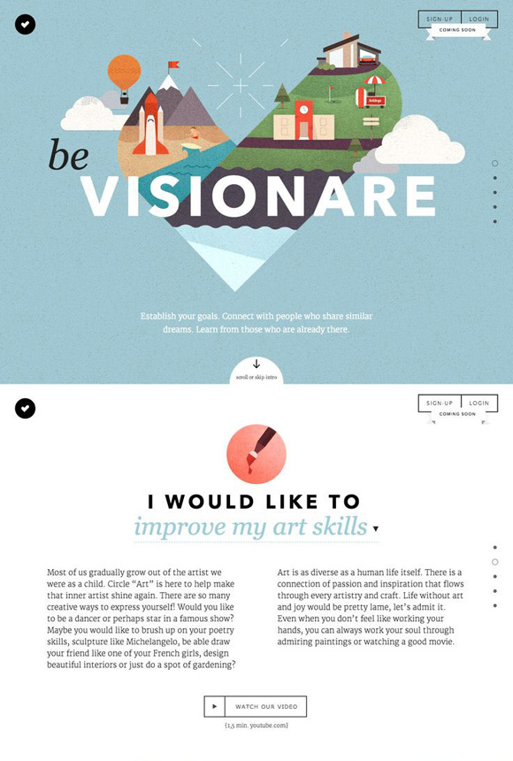 Egy olyan webfelület ahol hasonló művészeti célokat kitűző embereket hoznak össze, hogy "elérjék egymás segítségével a közös álmaikat". Segít az oldal célokat kitűzni és ezeket részfeladatokra bontani. Webdesigner szempontból érdekes parallax scroll technikát megvalósító szép flat webdesign.