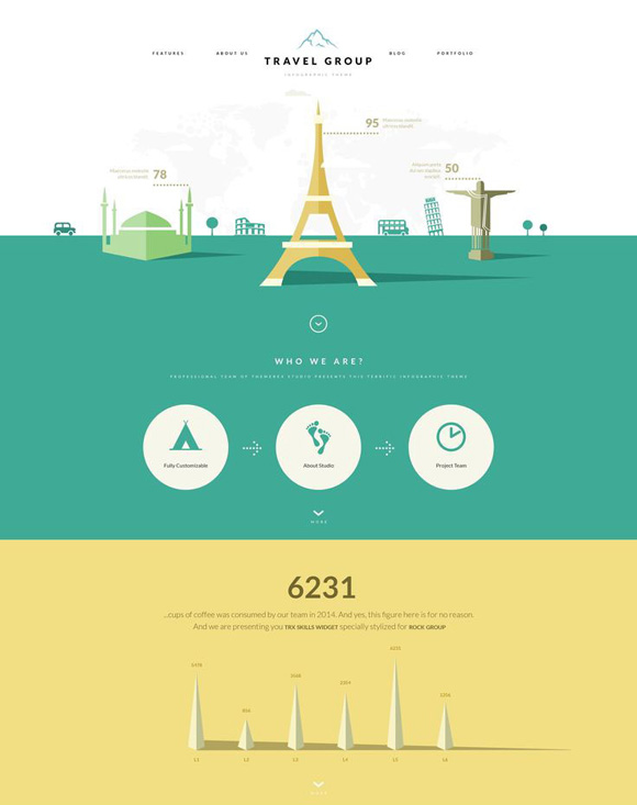 Ez kreatív infografika készítésére használható WordPress sablon, amely számos felhasználási lehetőséget nyújt kezdve gazdasági adatok bemutatásától egészen más akár SEO összefüggések egyszerű vizualizációjáig. Webdesign szempontból szép letisztul és jól alkalmazható flat design jellemzi.